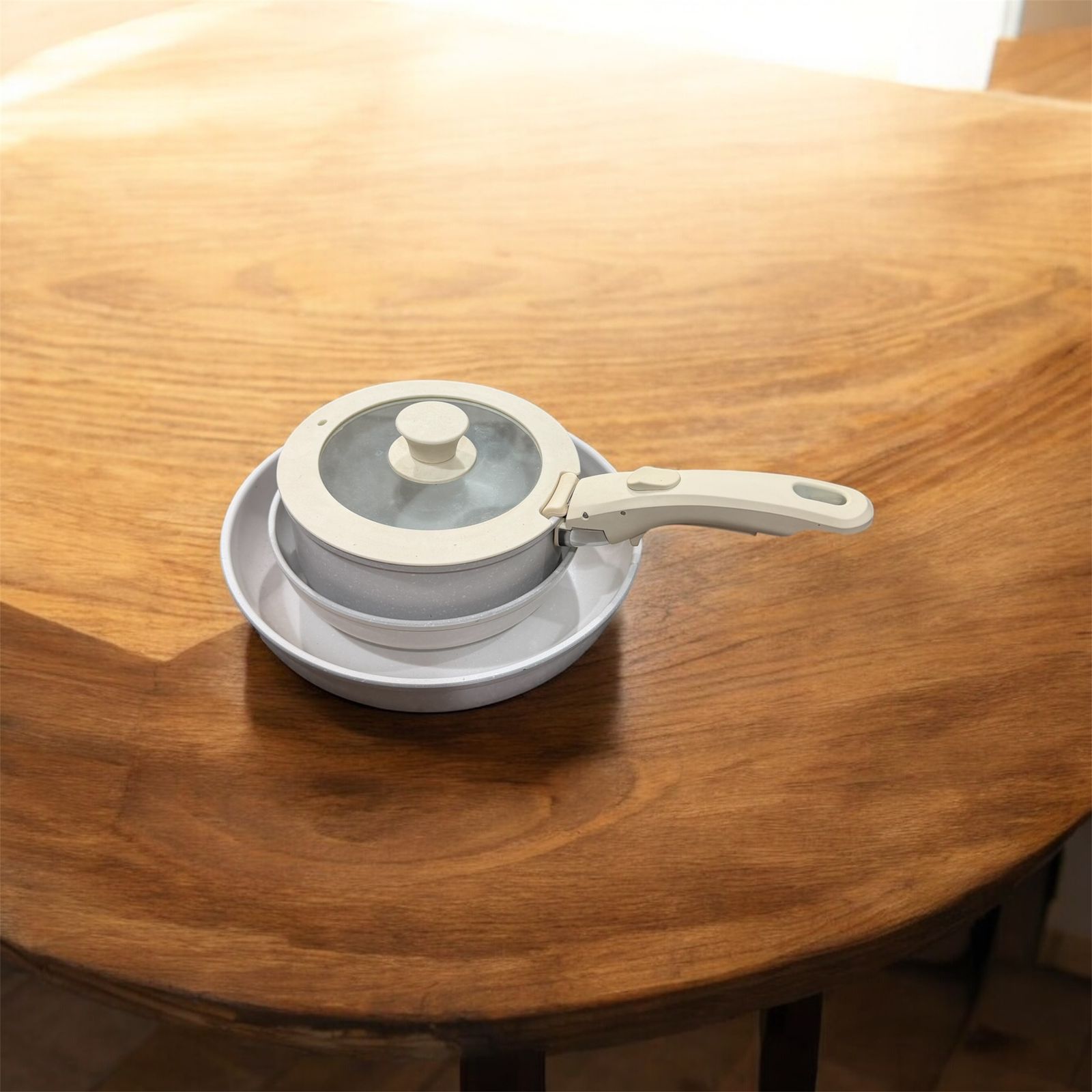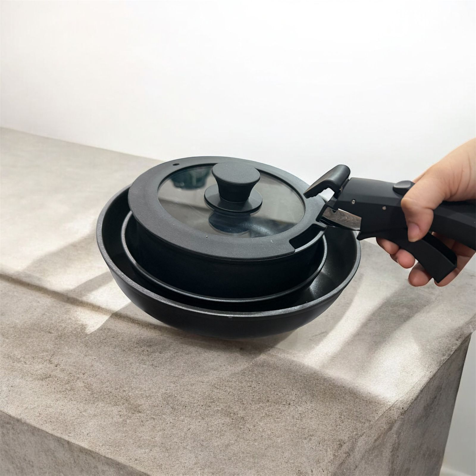 Juego de sartenes x 5 piezas con manija desmontable, el sartén más chico viene con tapa.