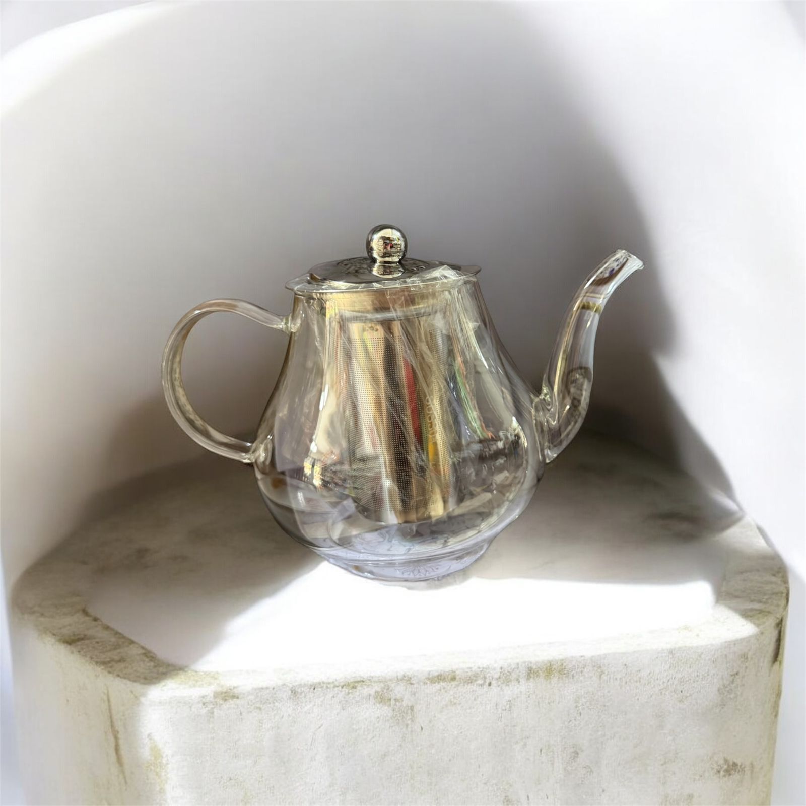Tetera de vidrio (1000 ml) con filtro y tapa de acero inoxidable.